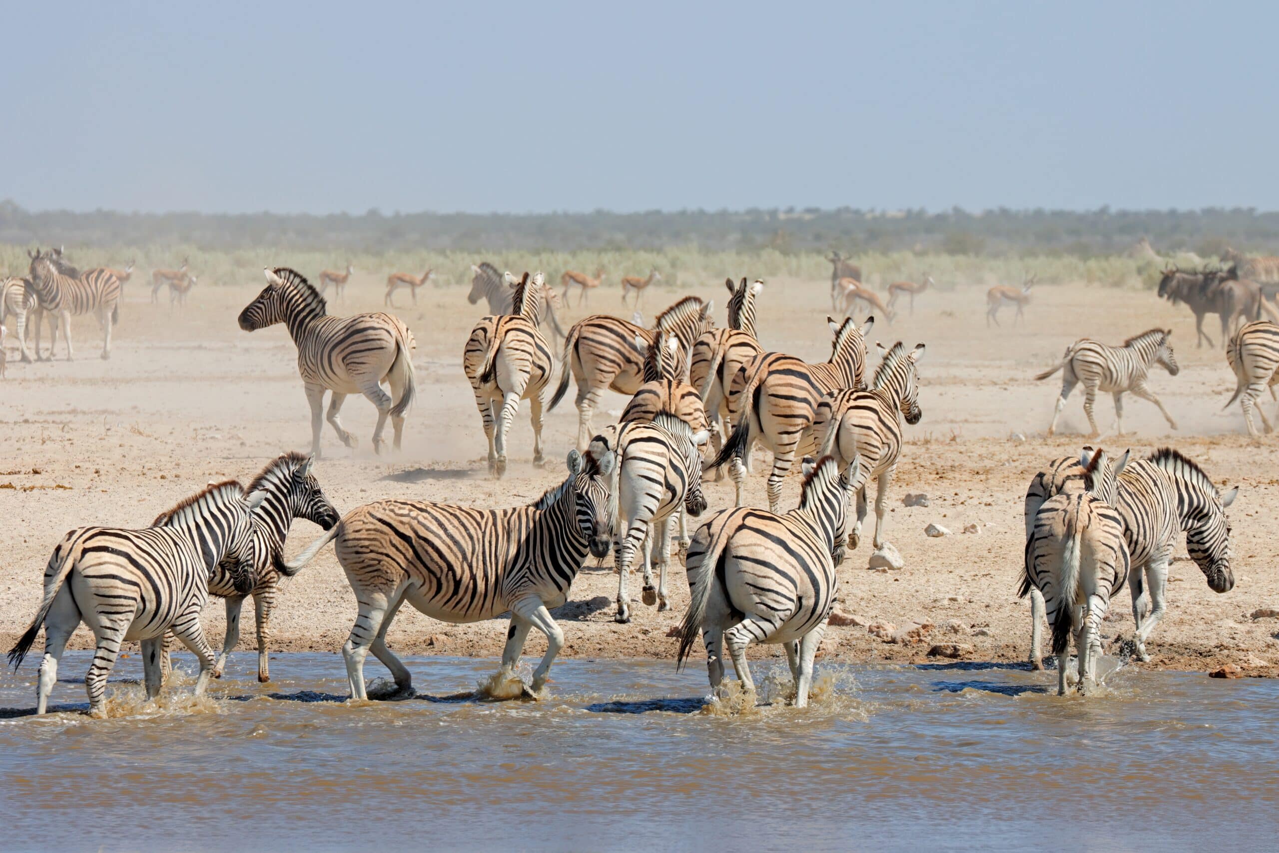 Le parc national d’Etosha est sans doute le joyau du pays. Avec son immense dépression saline visible depuis l’espace, il attire une faune impressionnante.